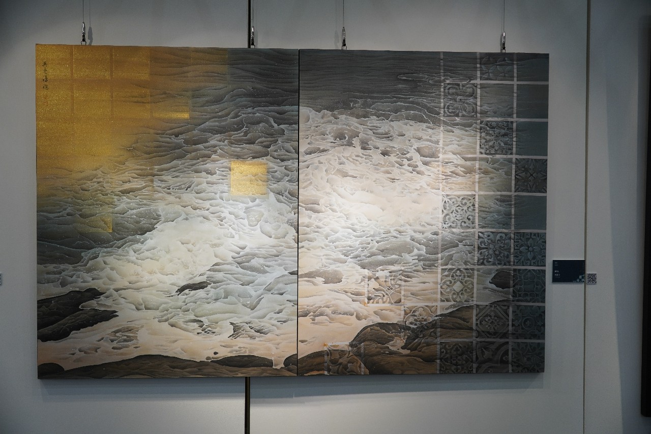 本次展出的「磺溪獎」作品,精準反映了當代媒材消融的趨勢。磺溪獎膠彩類得主吳惠淳的作品《逆光》,將故鄉臺南的花磚元素轉化為「基因代碼」,置於浮動的大海意象中。她受訪時表示,這件作品反映了她在城市移居間的漂流感,透過大海的液態變動,表達出對「當下」的珍惜。