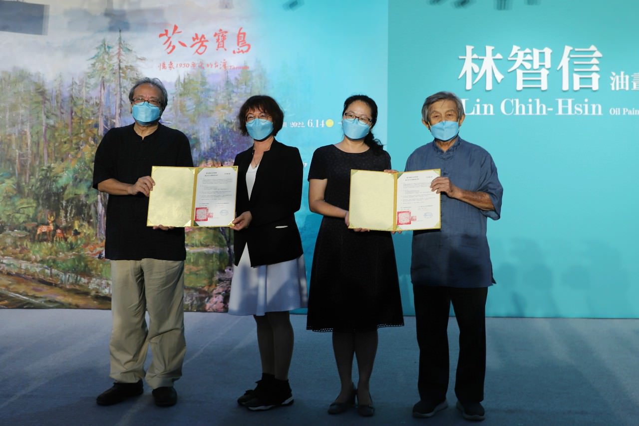國立臺南生活美學館館長黃瓊瑩(左2)與國立成功大學藝術研究所所長吳奕芳(右2)交換合作備忘錄,藝術家林智信(右1)、策展人蕭瓊瑞(左1)一同合影