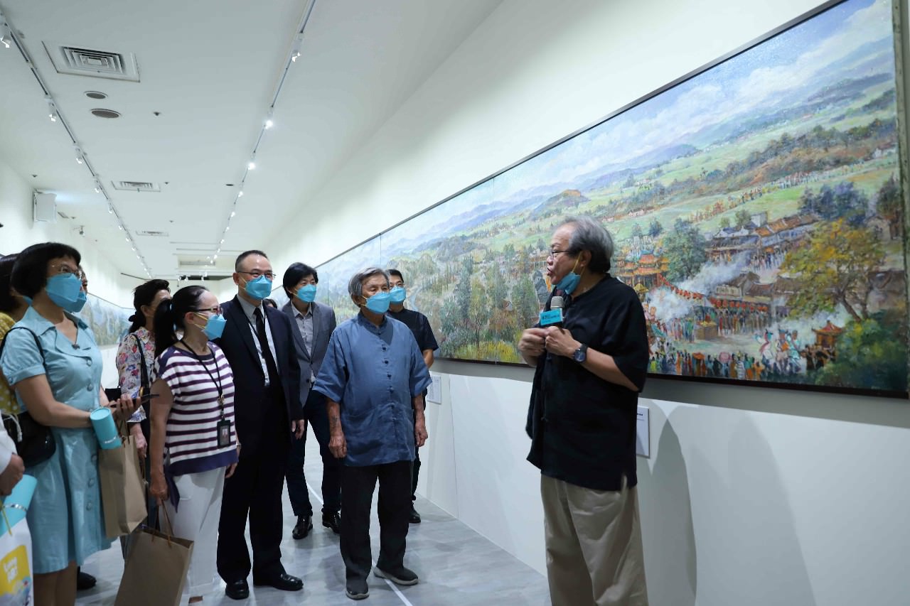 策展人蕭瓊瑞(右1)介紹藝術家林智信巨幅油畫《芬芳寶島:憶象1950年代的台灣》