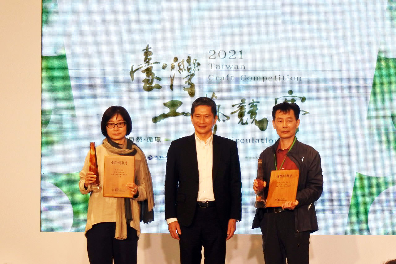 文化部長李永得(中)頒贈2021臺灣工藝競賽「二等獎」獎座及獎狀予得主黃淑萍(左)及蔡政宏
