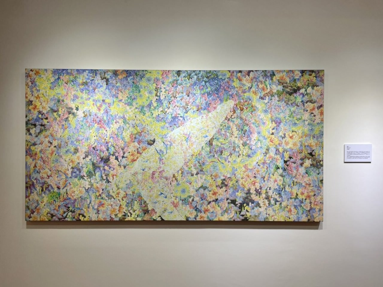 周佑貞作品以海作為創作題材,將蠟筆使用疊色技巧與針筆刻畫於石膏版上,圖為作品《鰭丘》