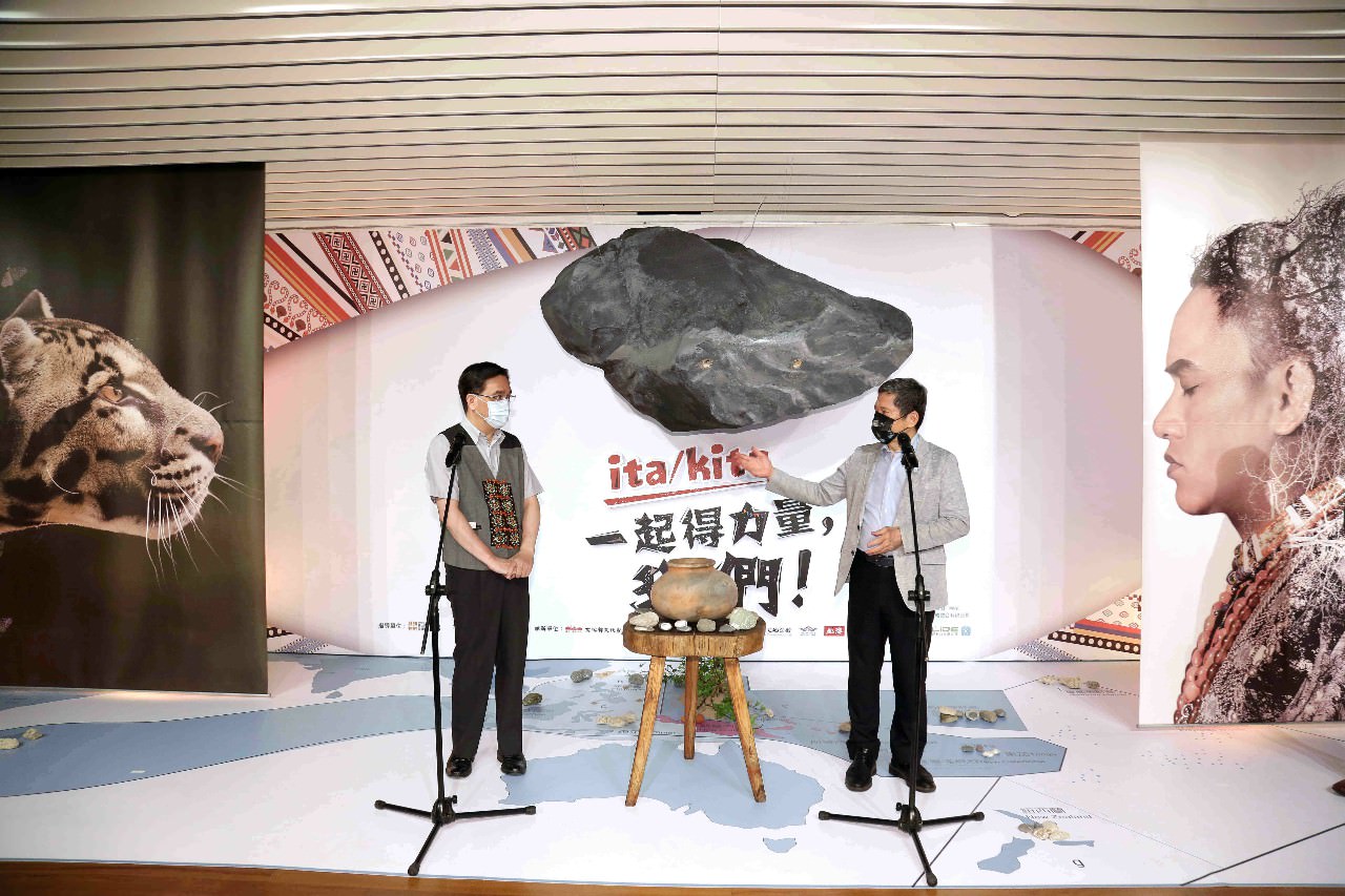 此次「原住民族日」特展以「ita/kita一起得力量,我們!」(ita/kita是南島語族古語,我們之意)為主題,由策展人馬紹・阿紀Masao Aki策展。展覽入口處以likuljaw(北排灣語:雲豹)及fakong ‘atomo(豐濱陶甕)代表臺灣的玉山,以充滿力量的光束投射至懸浮在空中的巨石,映照於南島語系分佈地圖上,並以多項主題規劃,和國人分享原住民族多元的藝術創作成果及文化。