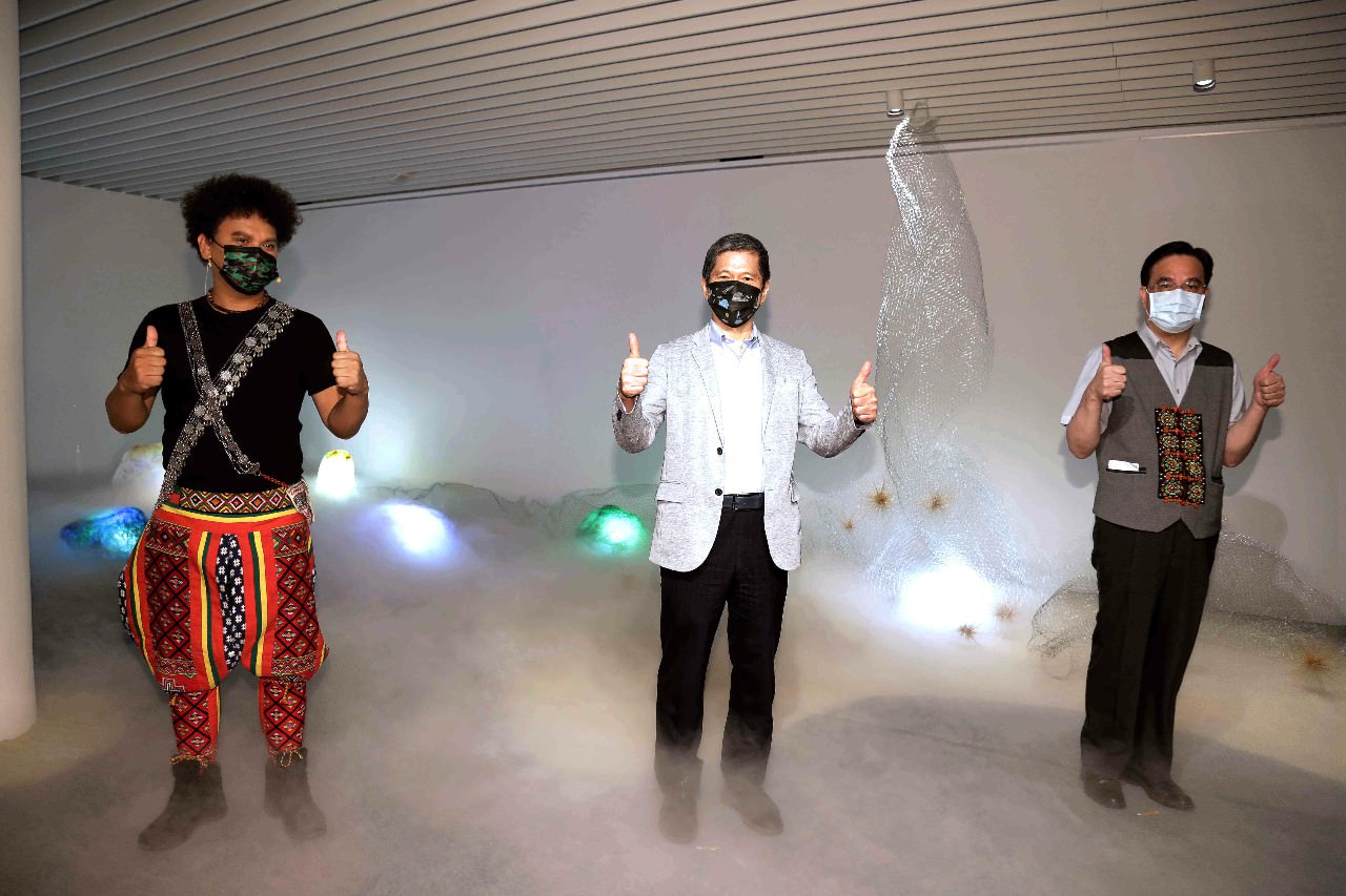 左起卑南族金曲獎創作歌手桑布伊、文化部長李永得、原住民族委員會主任委員夷將・拔路兒Icyang・Parod合影