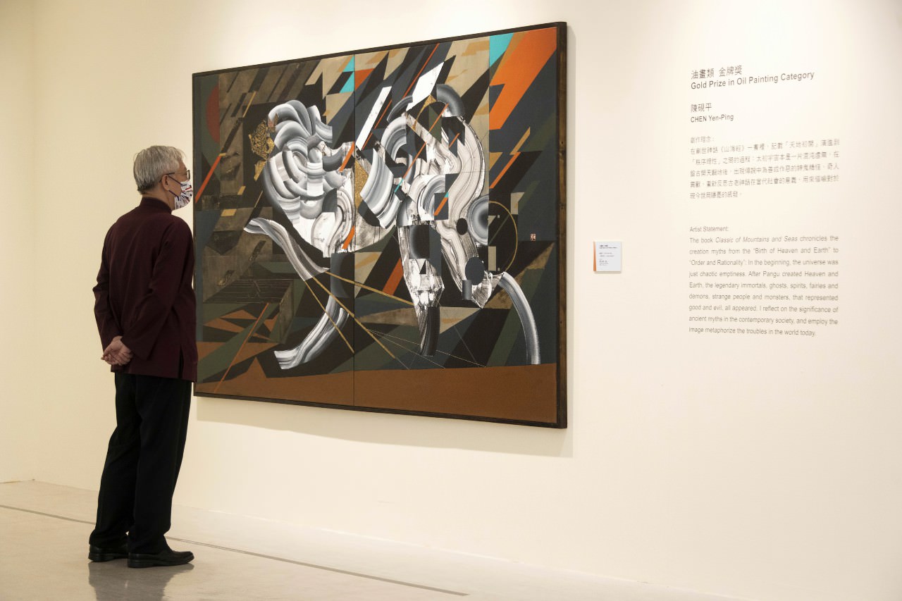 本屆得獎作品以不同的藝術語彙論述各式課題,表現出不同的個人風格及特色。例如,書法類金牌獎於同生的作品〈飛天結海對聯〉,以榜書創作的「飛天鏡,結海樓」六個大字,呈現作品磅礡的氣勢,具有強烈的視覺效果;篆刻類金牌獎劉冠意的作品〈鐵筆逸境〉,是她集多年閱讀、旅行和生活之體悟,在刀、筆、石之間,反覆探尋方寸之趣及線質之美的表現;攝影類金牌獎朱立葦作品,原題名為〈相生相〉,但將筆畫拆解,意指分崩離析的困頓處境,與並置影像相對應,並呼應困頓的世界,顛倒了日常。藉此隱喻新冠病毒肆虐,鎖國與封城政策,阻斷了人與人間的交流,限制了移動的自由。油畫類金牌獎陳硯平的作品〈戰穹奇II〉,由創世神話《山海經》發想,透過神話隱喻省思當代社會及世局;雕塑類金牌獎得主林宗龍運用不同色彩的石材拼接,呈現既含蓄又性感的身體型態。本展作品在各類別不同媒材的轉譯、詮釋下,在內容上陳述多元的脈絡及風貌。