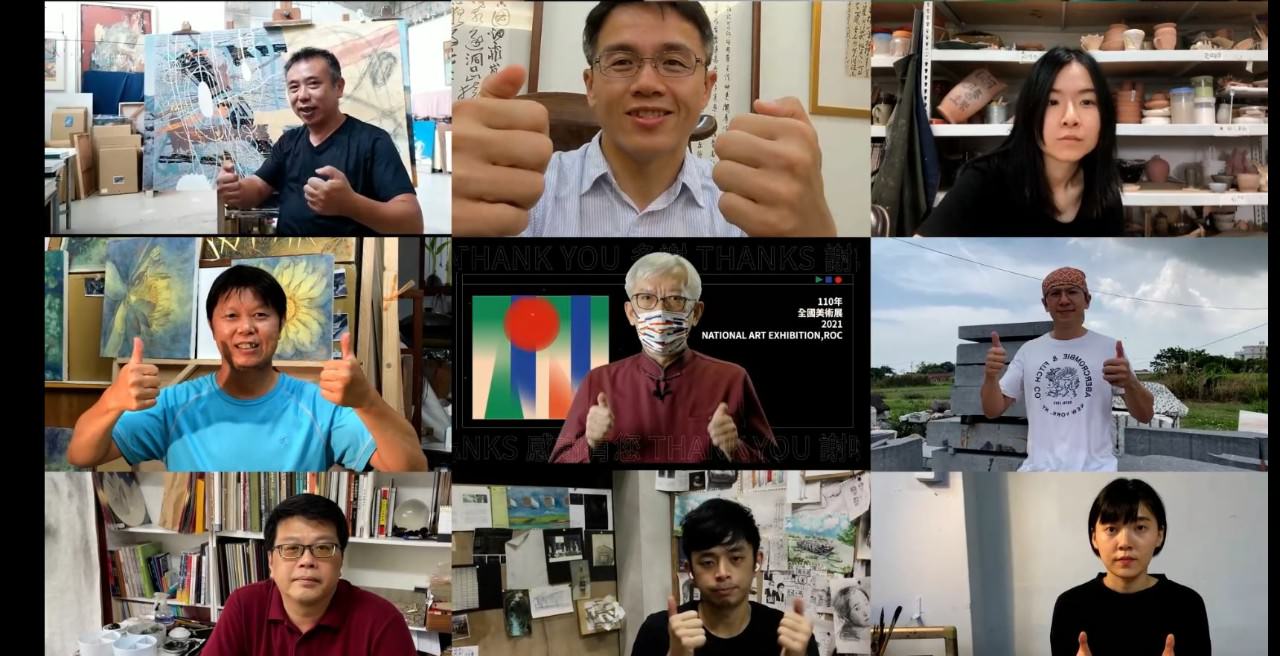 梁永斐館長(中)於線上頒獎影片中,與免審查獎及得獎者比出感謝手勢