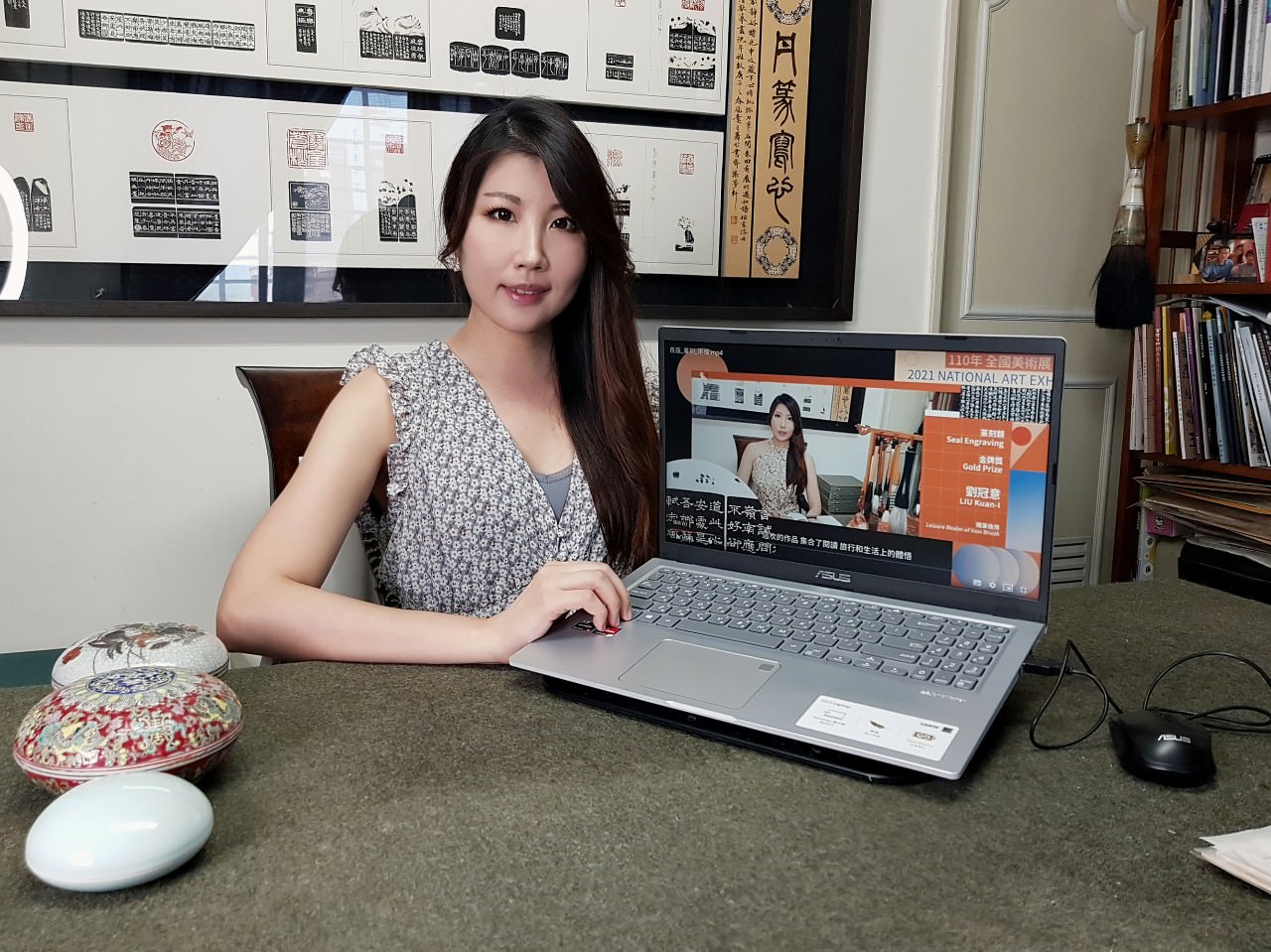 篆刻類金牌獎得獎者劉冠意觀賞線上頒獎典禮影片情形