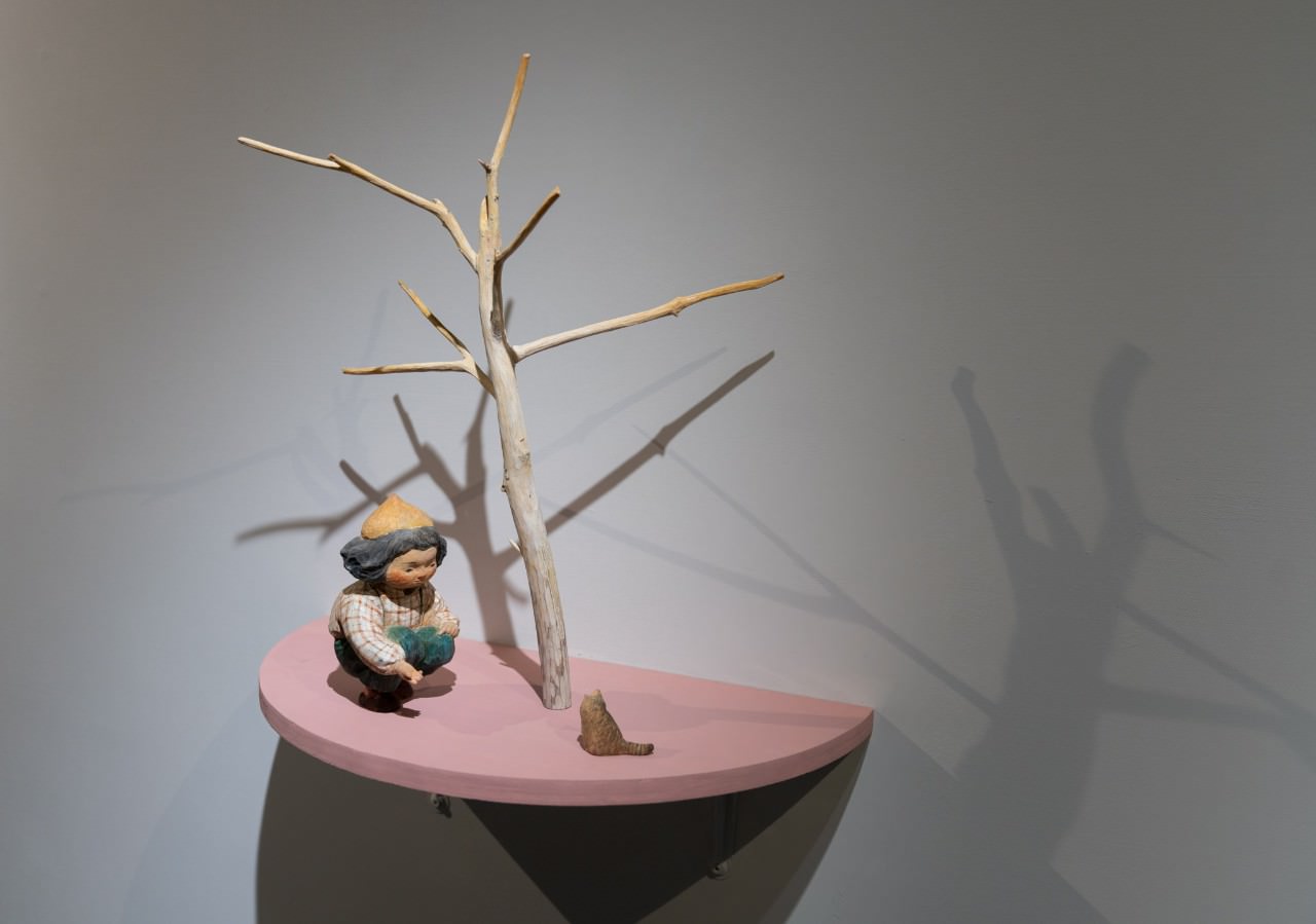雙主修書畫與雕塑的慧琳來自三芝,平面轉到立體的創作過程,她花了比雕塑系的學生更久的時間才完成,主題的少女與貓來自藝大生的生活,很真誠的將女孩的心思藉著木雕創作來呈現,水墨專業讓她的作品在色彩呈現上有繪畫性的效果。