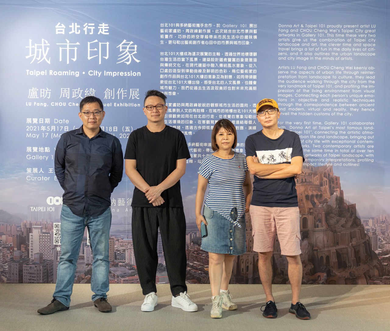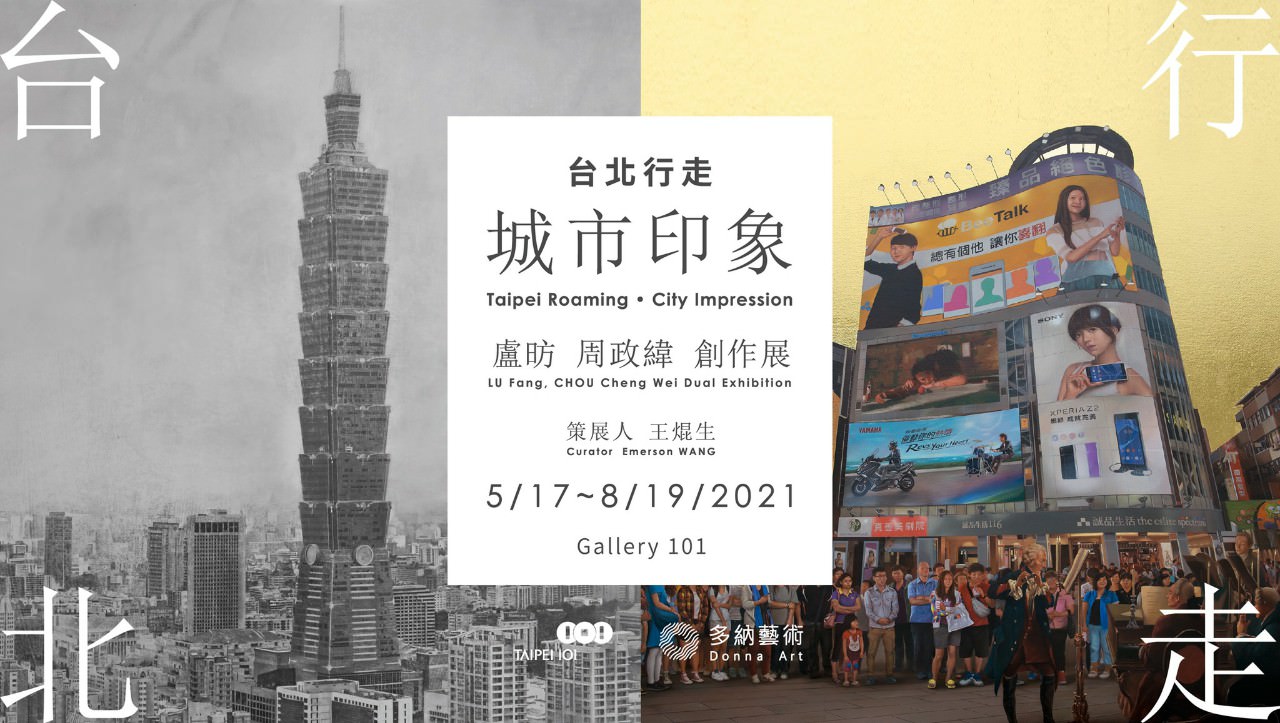 行走都會地景的人文意象 文/王焜生 (獨立策展人)台北101與多納藝術攜手合作,於Gallery 101展出藝術家盧昉、周政緯創作展。此次結合台北市景與藝術畫作,巧妙的時空穿越帶來市民生活中的趣味橫生,更勾勒出藝術創作者心目中的市景與城市印象。