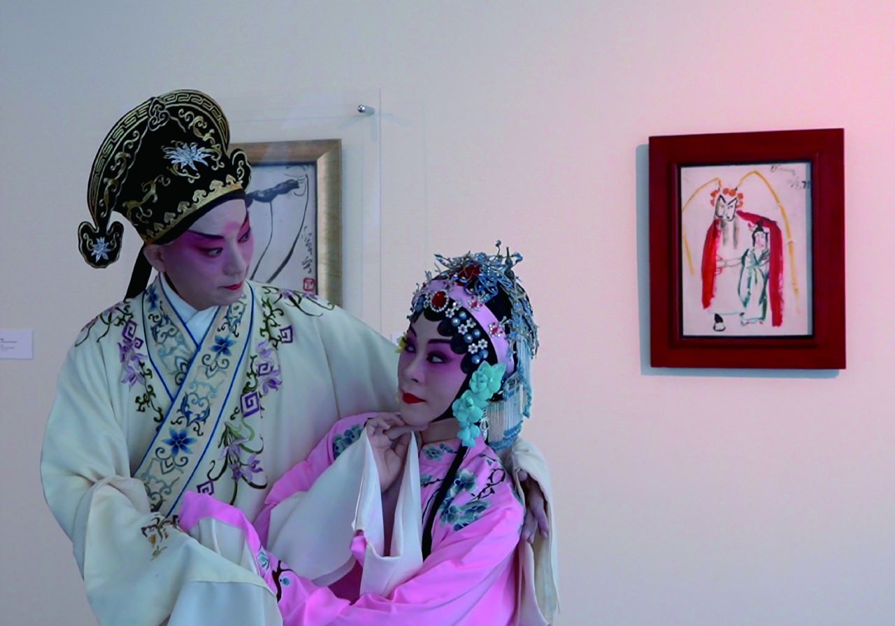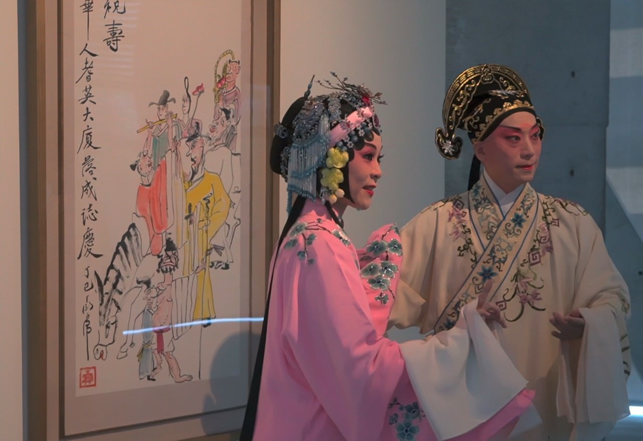 國光劇團小生趙揚強(右)、花旦劉珈后,在丁衍鏞「八仙祝壽」畫作前,以今仿古,頗具韻味