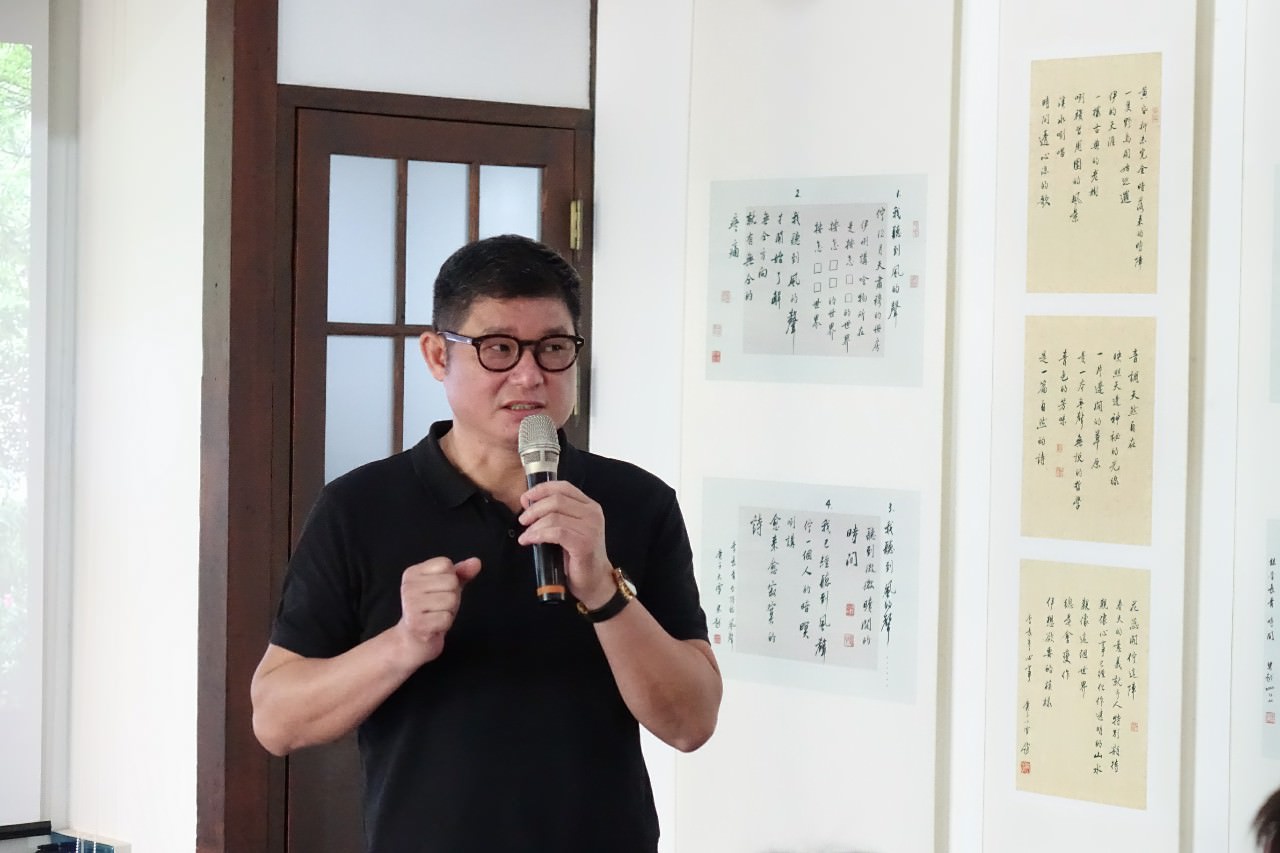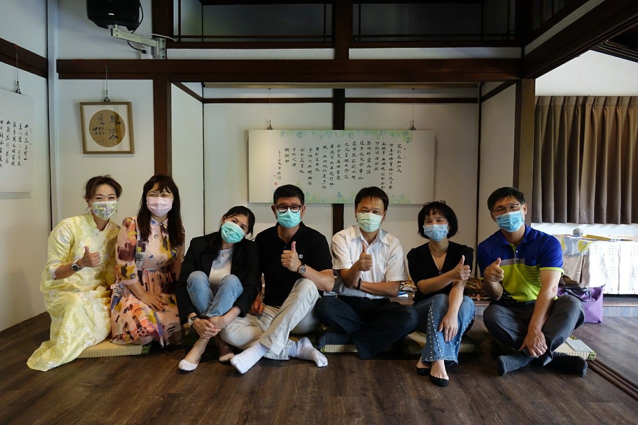 緊接著是梁老師的現場導覽,梁老師引用蘇東坡曾說下筆要作五百年想,比喻每件作品的用心投入,尤其作品〈清香〉以捲棚的形式懸掛於文學館的日式建築天花板;置於窗檯前的〈春江花月夜〉書寫於正大筆莊之陳景聰老師提供己裝裱之空白長軸,是本次展覽最晚完成的作品,二者均恰契合了臺中文學館空間尺度;遠望窗外書寫的〈風搖翠竹故人來〉,意喻「風動了、翠竹動了、觀迎各位朋友到來」之意,最後整場活動在忘年知音的民歌演唱中熱鬧結束。