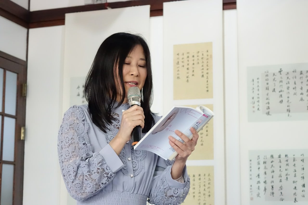 本次展品除古典詩外,亦書寫了李長青老師《風聲》詩集中的台語詩、姚時晴老師《我們》詩集中的現代詩,姚老師現場致詞時說明:詩是平面的語言符碼,藉由讀者閱讀或藝術家的再次創作而產生當代的文學想像,如書中的〈黑貓書寫〉這首詩,梁老師書寫的撒嬌二字,似乎可讓人感受到貓爪親膩的抓扒。姚老師亦現場朗頌〈山木樨 植夢〉這首詩,山木樨就是桂花,當夜晚不經意地傳來桂花的香氣,彷彿是進入桂花的夢境。梁老師進一步說明紙張就是場景,圓形代表夜空,上面點綴著淡淡的黃色花朵,來表達這首時的意境,聽眾莫不為這樣細膩典雅的呈現而讚嘆。