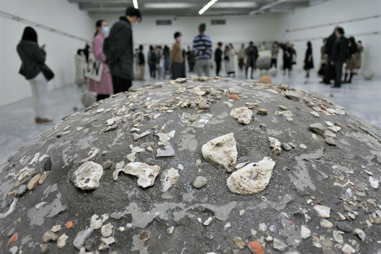 王煜松把踏查遺址過程中所撿拾的貝殼、紅磚等異材質嵌入球體的水泥層內,有如將其遊歷的空間收容於中,數顆大小不一的球體散落於展場,或隨著地心引力運行於蜿蜒的軌道上,與觀者漫遊的路徑時而相遇時而分道。球體的滾動聲、人與物彼此間移動的光影交疊、隱約的低頻環境音,觀眾跟著身體的感官,沉浸在自我想像的時空。藝術家引用波赫士的一段描述表達其思索的狀態:「…一個由迷宮組成的迷宮,一個錯綜複雜、生生不息的迷宮,包羅過去和將來,在某種意義上甚至牽涉到別的星球…」