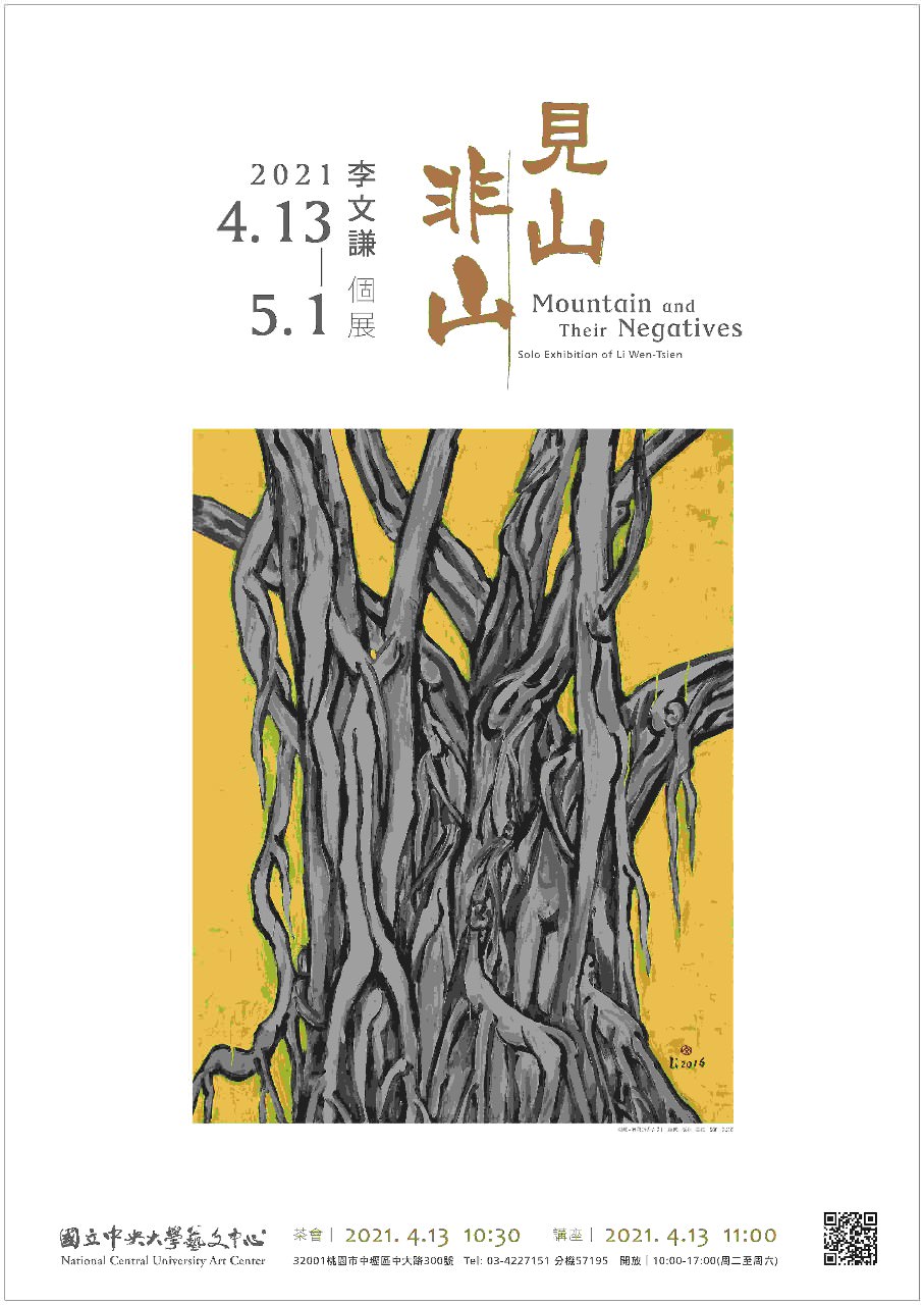 「見山非山-李文謙個展」將於4月13日(二)上午10:30,於中央大學藝文中心舉行展覽開幕式,展期自4月13日至5月1日,免費參觀,開放時間為周二至周六10:00至17:00,周日至周一及國定假日休館。