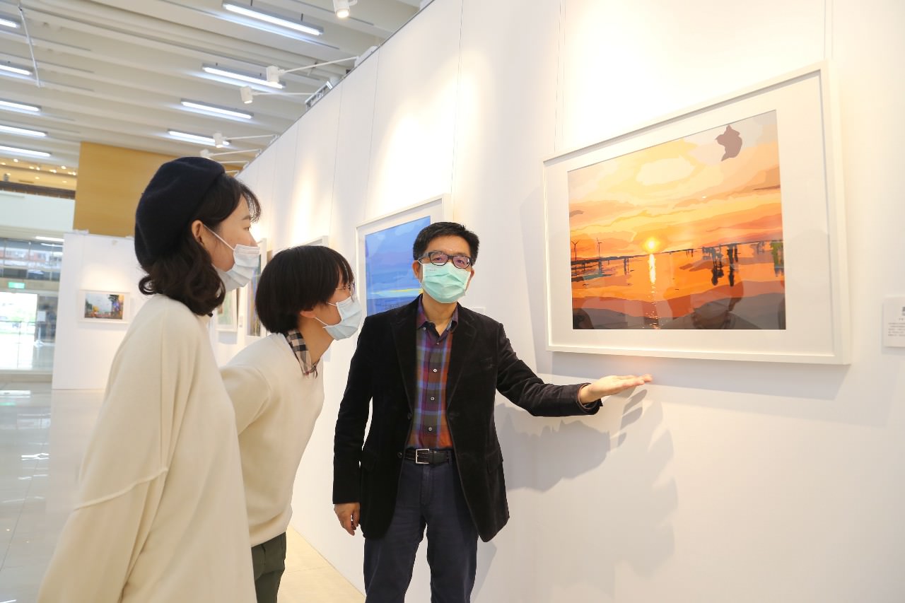 「屋頂上的藍天」利用垂直水平交錯、數位圖像繪製霧峰林家的屋頂樑柱,左右漸淡,中空三格顯示藍天,彩紫交織的都會意象,意蘊穿越時空的思古幽情。3D繪製作品「灰暗中的曙光」,全球因Covid-19襲擊,人們禁錮於幽冥飄渺煙霧中的黑暗空間,曙光突破灰鬱自窗戶流洩入內,是對未來光明的期許。