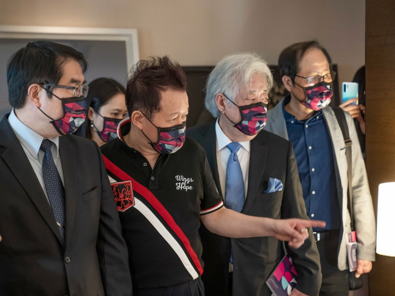 2021 台南藝博貴賓預展,左起臺南市長黃偉哲、畫廊協會理事長張逸羣、臺南市美術館榮譽董事長陳輝東、臺南市美術館董事蘇憲法