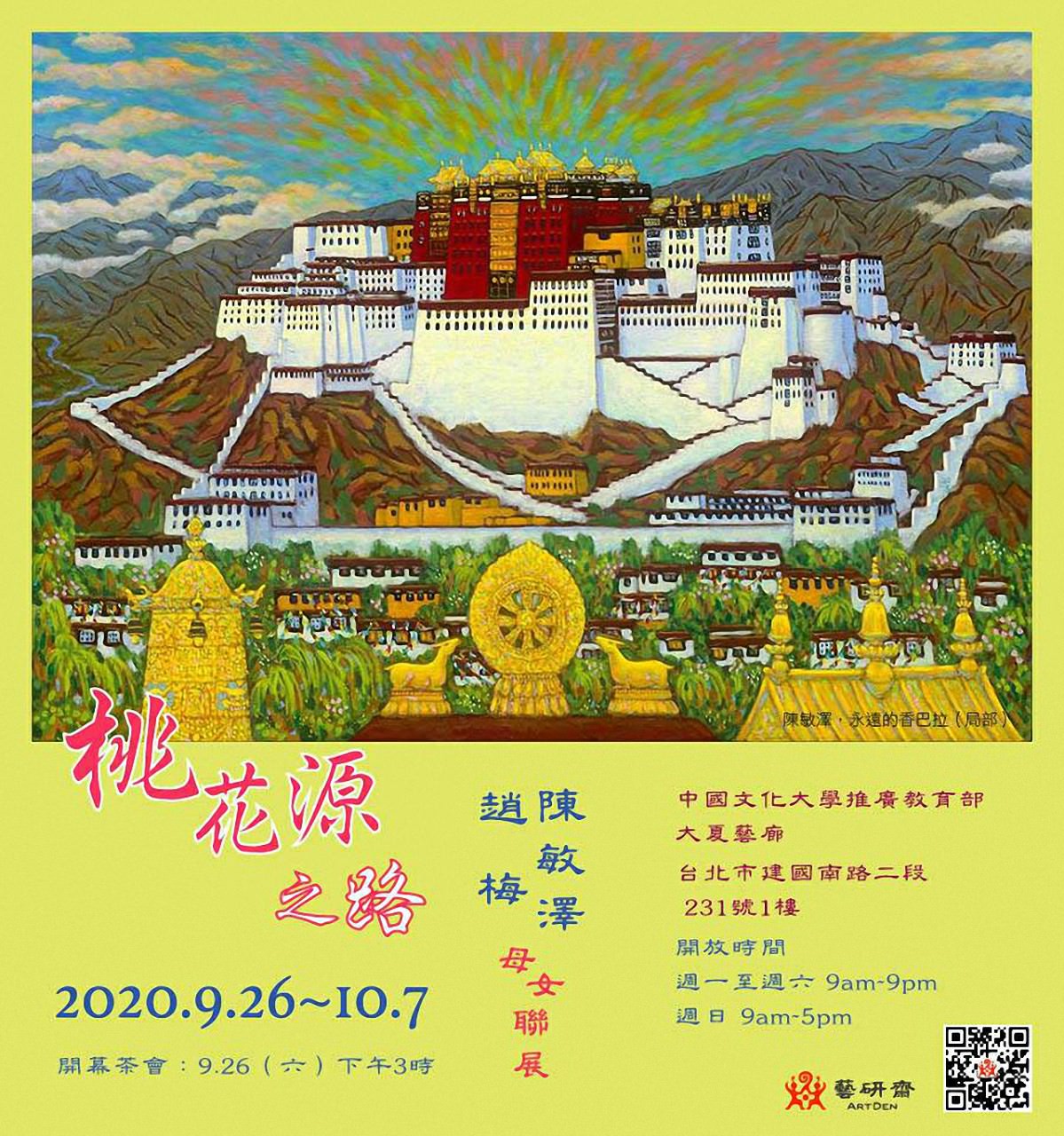陶淵明寫「桃花源記」,以寓言的方式展現其衷心嚮往的生活、理想世界。對於許多以追尋美為目標的藝術家而言,創作,即是建構自身心目中的桃花源;趙梅和陳敏澤這對母女,也屬於此類。沈浸在筆下唯美的題材畫面,藉由繪畫忘卻真實生活的種種不適意;作品完成後凝視欣賞,恍如美好時刻永駐停留,煩惱憂傷又被扔到另一個世界。畫畫為的是心理上「避秦」,故而展覽命名為「桃花源之路」。陶淵明筆下的漁人離開後再也找不著路回去,但對藝術不離不棄的人,桃花源之路,一直都在。本次展出作品皆為油畫,趙梅以旅遊各地取材的風景和花卉為主題,陳敏澤則是青康藏高原系列創作,包括以布達拉宮為中心,寬3米4、高80公分的華麗炫目大作「永遠的香巴拉」。世外桃源,近在咫尺;歡迎前來,一同悠遊。