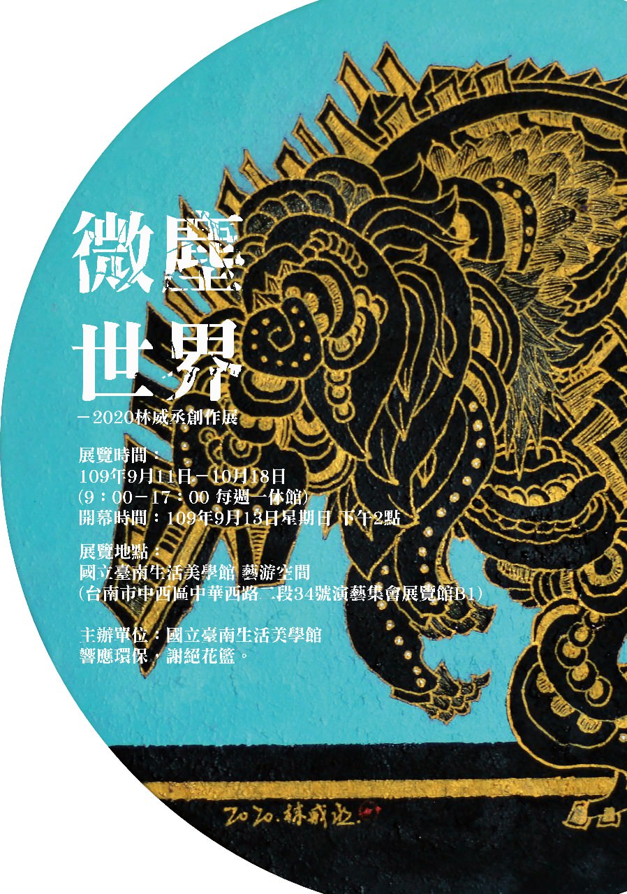 「微塵世界」的命名有其雙重意涵:第一,作者自號「微塵」(因取名字諧音),故「微塵世界」的命名彰顯了作者自身的存在,表述這是以作者思想、認知為基礎而生發的世界,是一種主體性的展現。第二,《金剛經》經文內容提到,這大千世界由眾多「微塵」(甚至更小的微塵)所組成,將「微塵」當成是各種元素的最小化,這些元素在因緣合和之下,暫時聚合成這世界上各種人、事、物的形貌,存在這個物質世界,但再經過因緣合和的作用之下,可能又變換成別的物件,或是復歸「微塵」。展覽作品中所呈現的怪獸圖像,便是在此意念之下進行造型,搭配不同神話文本、歷史故事、日常所感,而組織出的不同面貌。而在表現方法上,延續傳統水墨以線條為主的表現形式,搭配當代的媒材實驗,嘗試各種不同的面貌,專注在肌理質感、平面空間、裝飾圖樣的探討,希望在主要概念之下發展各種不同的子系列嘗試,並以此塑造個人風貌與作品特色。