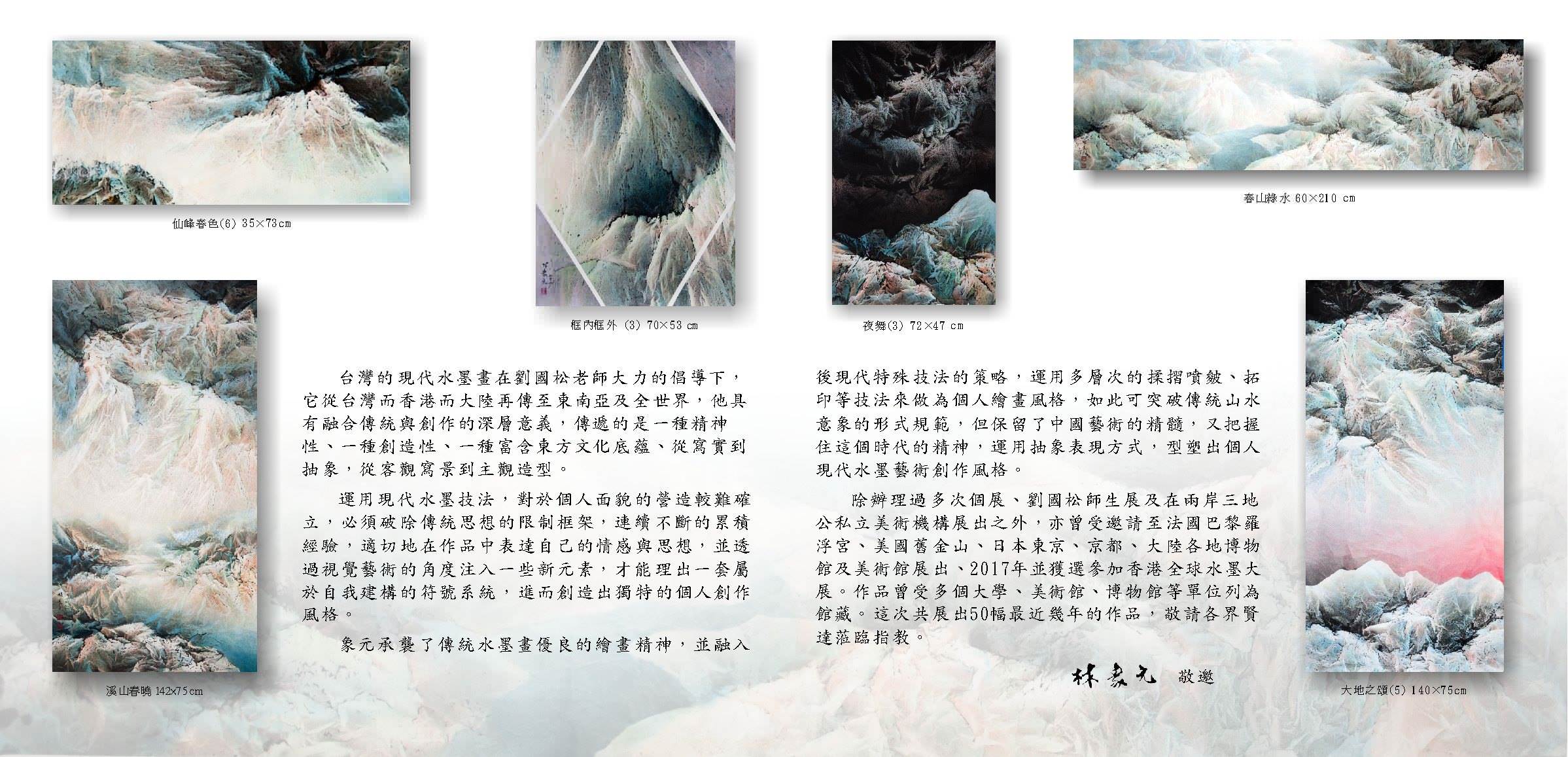 除辦理過多次個展、劉國松師生展及在兩岸三地公私立美術機構展出之外,亦曾受邀請至法國巴黎羅浮宮、美國舊金山、日本東京、京都、大陸各地博物館及美術館展出、2017年並獲選參加香港全球水墨大展。作品曾受多個大學、美術館、博物館等單位列為館藏。這次共展出50幅最近幾年的作品,敬請各界賢達蒞臨指教。