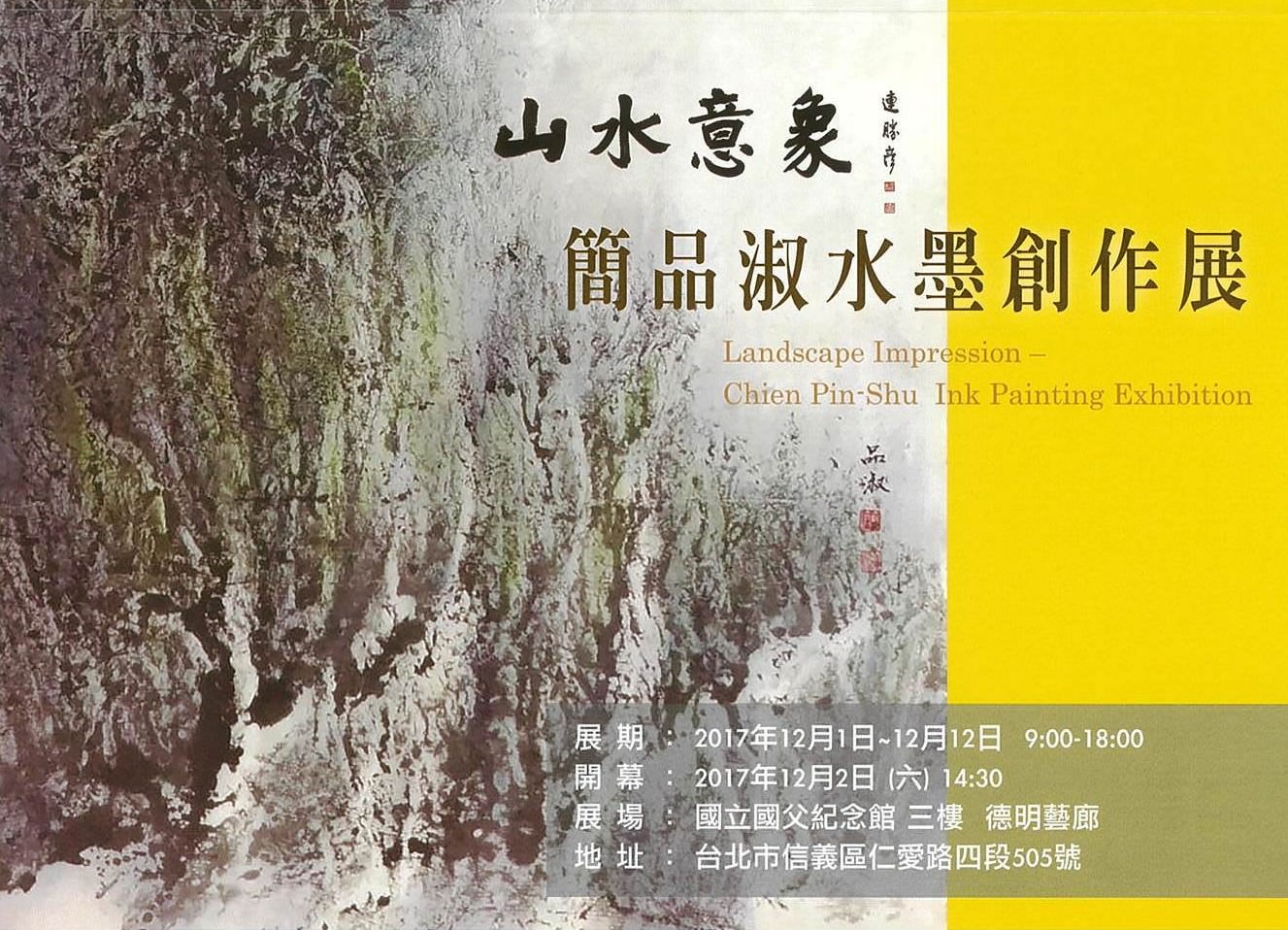 「山水意象─簡品淑水墨創作展」,將於本(106)年12月1日起至12月12日止,在文化部所屬國立國父紀念館德明藝廊展出。簡品淑,國立臺灣大學植物病理學系畢業,現任臺灣植物保護工業公會秘書長。從事現代水墨創作、鈞瓷創作。著有「山水寄情-簡品淑水墨作品集」、「意象山水-簡品淑水墨作品集」、「簡品淑鈞瓷作品集」。