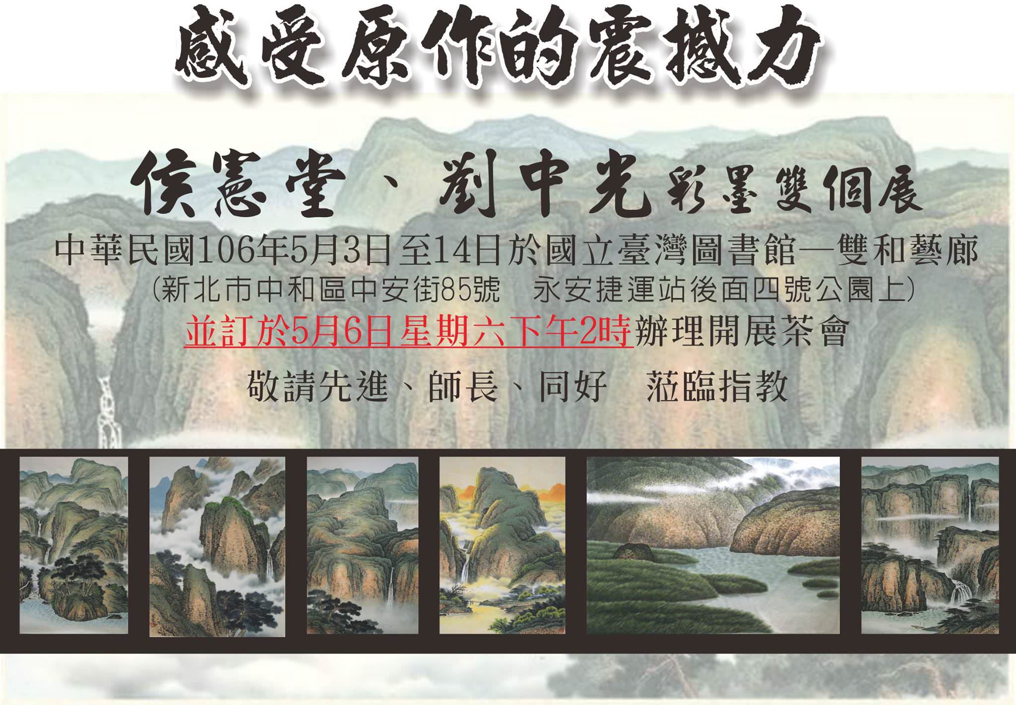 中華民國106年5月3日至14日於國立臺灣圖書館─雙和藝廊 訂於5月6日星期六下午2時辦理開展茶會,歡迎大家一起來欣賞。 >>侯憲堂個人美術館 >>劉中光個人美術館