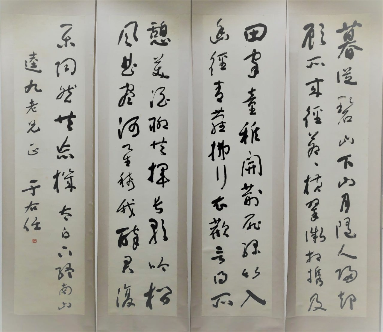 于右任-唐.李白〈下終南山過斛斯山人宿置酒〉135x35cmx4行草四屏