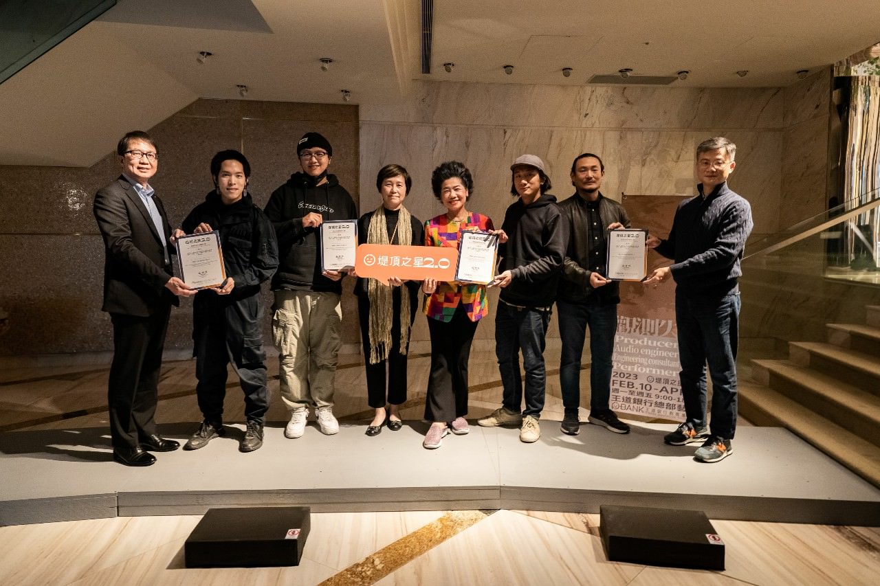 堤頂之星2.0入選展《觀測失效》開幕活動頒發入選證明,右起王道銀行李芳遠總經理、製作人賴彥勳、混音師黃子定、王道銀行教育基金會曾淑芸董事與黃巧慧執行長、工程顧問陳欣孟、表演者張猷琛、中華票券張政權董事長。