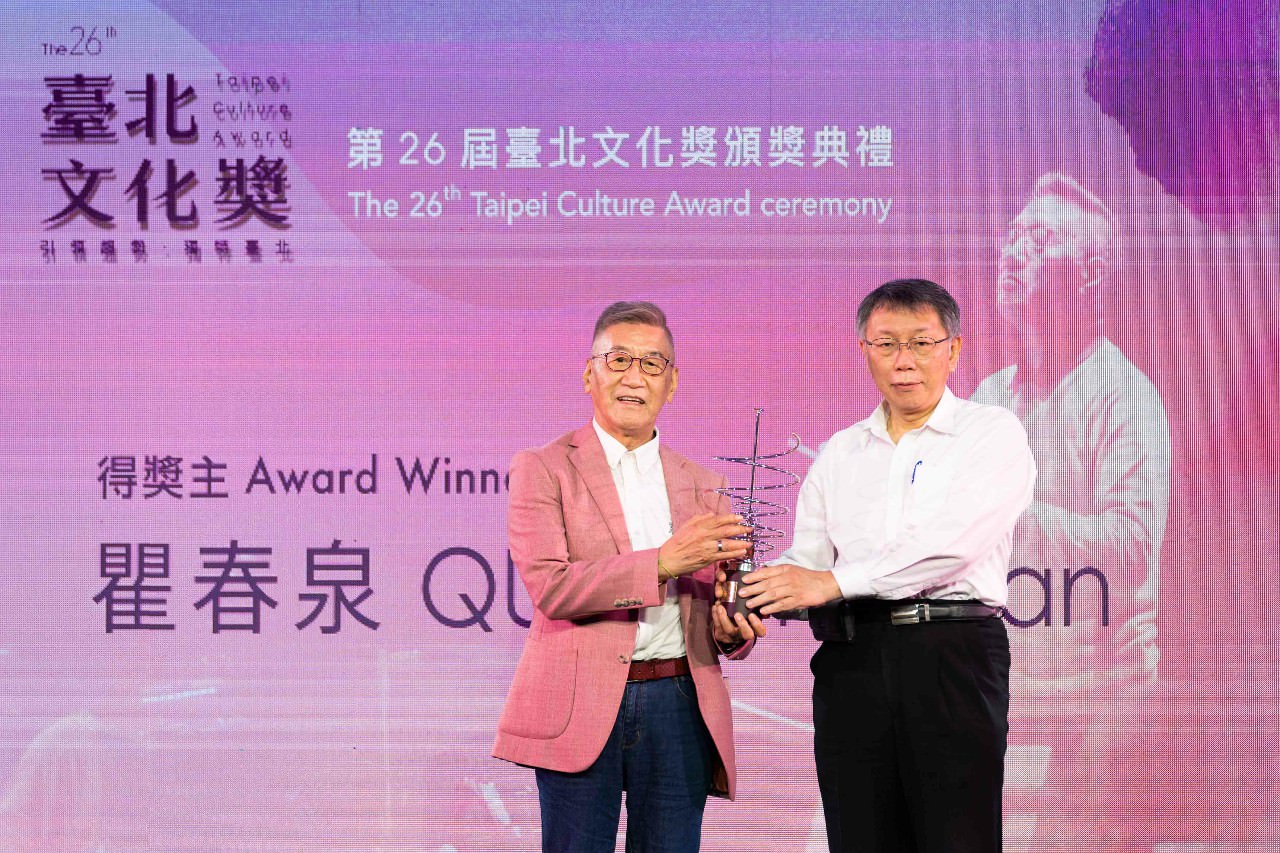 第26屆臺北文化獎頒獎典禮今天登場,本屆得主分別為推廣文學不遺餘力的學者詩人陳義芝,以及長期致力於國樂文化推廣傳承的國樂大師瞿春泉。今日頒獎典禮邀集藝文先進及後輩們齊聚,並由柯文哲市長親自頒獎,見證兩位得主在文化領域深耕的豐碩成果,展現臺北市豐厚的藝文孵育環境。柯市長於頒獎典禮致詞時首先恭喜兩位得主,並表示臺北文化獎已辦理26屆,共有75位得主,表揚項目十分多元,顯示臺北多元共融的社會風貌。柯市長感謝陳義芝深耕教育領域和臺灣當代文學的深刻貢獻,同時感謝瞿春泉對臺灣音樂本土化的創作努力。柯市長也提及瞿春泉習慣在咖啡廳譜曲,並笑稱應該讓他擔任臺北市咖啡節的代言人。柯市長同時強調,臺北是一座文化多元共融的城市 感謝臺北文化獎歷屆得主的努力,讓臺北成為更有文化底蘊的城市。