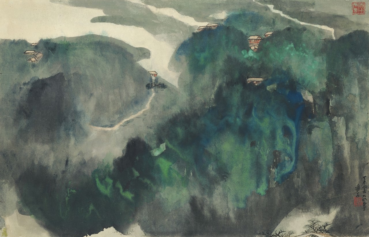 張大千(1899-1983),《浮巒暖翠》設色紙本 鏡框,68.8X96公分(27⅛X37¾吋),1967年作,估價:港元2,000,000–3,000,000/美元260,000–380,000