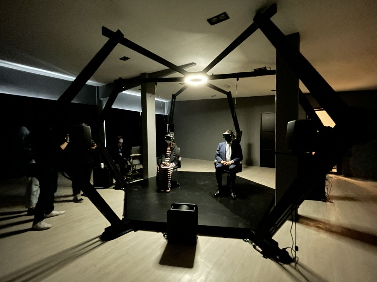 駐泰國代表處副代表徐蔚民(右)與文化組長田又安體驗結合聲響藝術的VR作品「悸動響」