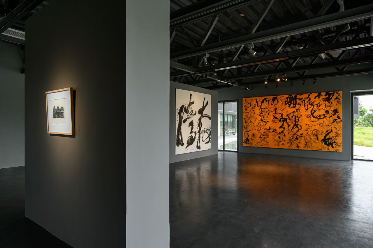 徐永進《道德經第一章》及紀經略《奔騰》以墨色及噴墨展現當代書藝如畫似字的特質。攝影/王世邦 桃園市立美術館提供