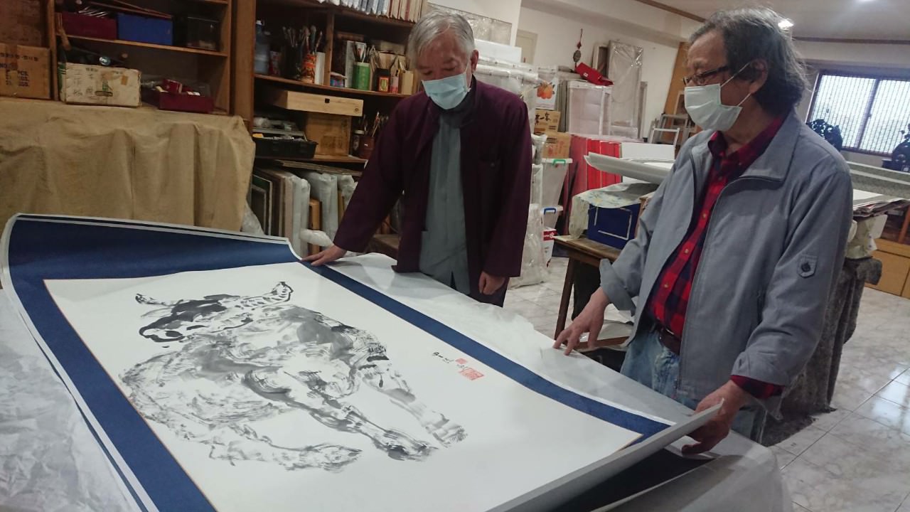 梁永斐館長(左)拜訪謝里法老師工作室,藝術家謝里法(中)分享2020-2021年期間創作作品