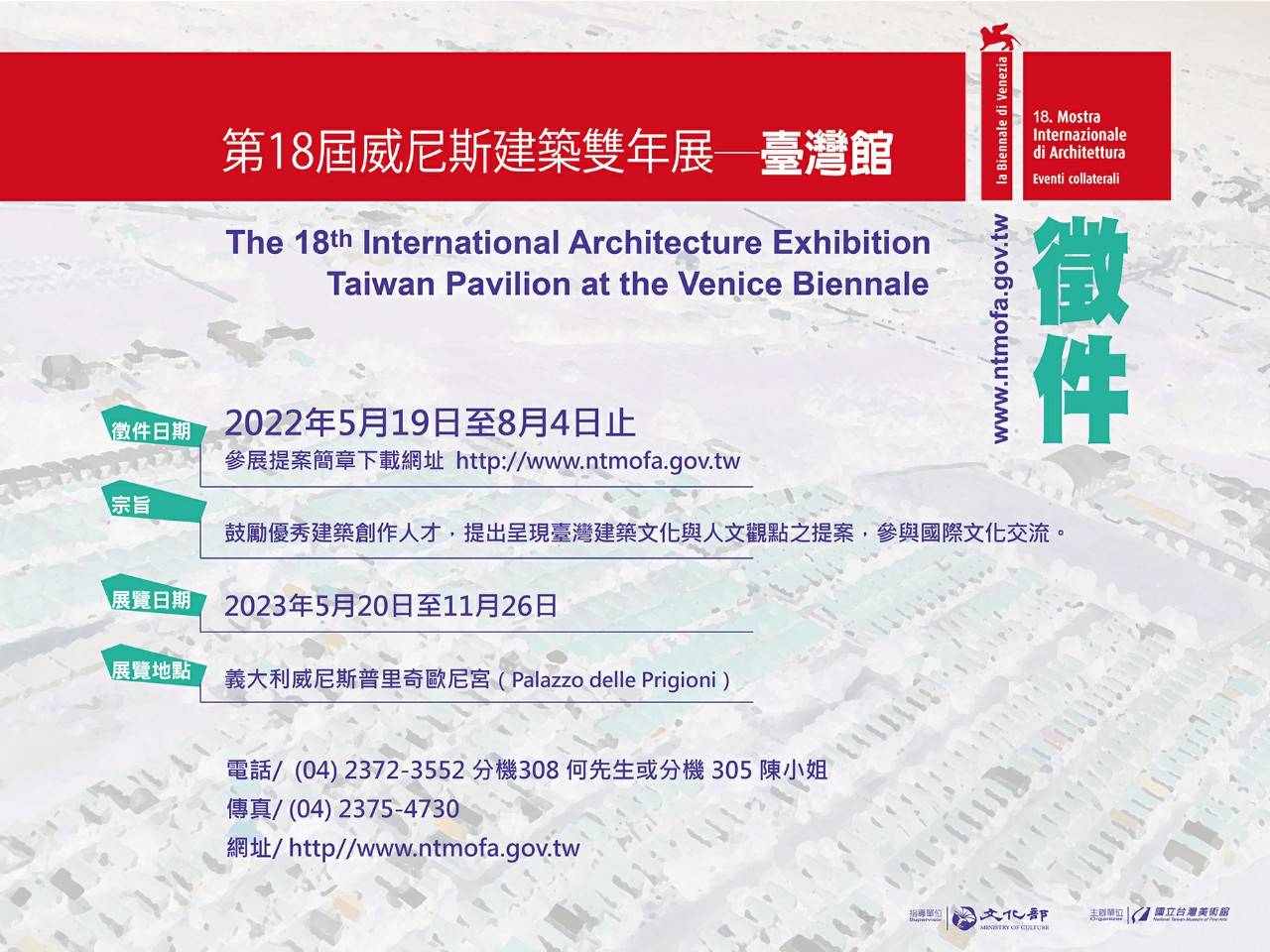 為鼓勵優秀建築創作人才,提出呈現臺灣建築文化與人文觀點之提案,以及參與國際文化交流,由文化部指導、國立臺灣美術館主辦的2023年「第18屆威尼斯建築雙年展﹣臺灣館」,將於今(2022)年5月19日起至2022年8月4日止對外公開徵選「臺灣館」參展提案。「第18屆威尼斯建築雙年展--臺灣館」徵選案,主辦單位仍承繼歷屆精神並秉持開放尺度,鼓勵優秀建築人才追求突破與創新,提出能與當代世界對話、分享,且具啟發性、挑戰性觀點,並足以完整呈現於臺灣館內之參展提案,並從中徵選出最優之作品代表我國參加「第18屆威尼斯建築雙年展」。「第18屆威尼斯建築雙年展」展期訂於明(2023)年5月20日至11月26日,參展地點以綠園城堡為主,而「臺灣館」方面,因歷屆美術及建築雙年展展場均在「普里奇歐尼宮」(Pallazzo delle Prigioni),該處已被大眾視為「臺灣館」所在,故將繼續沿用,作為2023年第18屆威尼斯建築雙年展「臺灣館」展覽場地。
