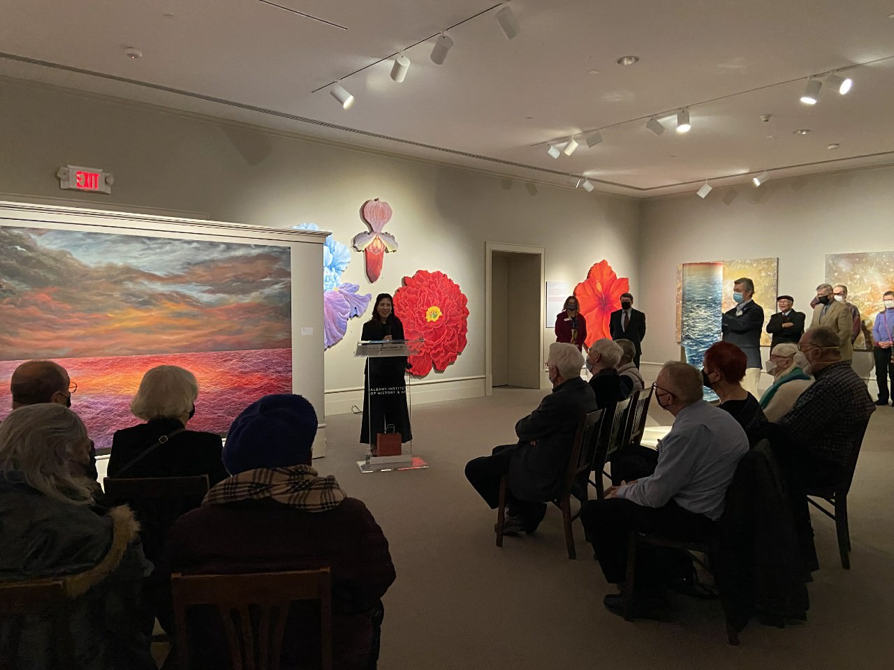 藝術家鄭麗雲受邀在紐約州首府奧本尼歷史與藝術學院美術館(Albany Institute of History & Art)舉辦個展《The Four Elements of Leigh Li-Yun Wen》,2月7日舉行開幕典禮及貴賓預展活動,奧本尼市長凱西‧施函(Kathy Sheehan)、紐約大學奧本尼分校校務發展部副部長法汀‧薩南(Fardin Sanai)、駐紐約辦事處副處長張俊裕、臺北文化中心主任張惠君、教育組主任楊敏玲、紐約首府區臺美文化促進會創辦人陳仲欽等人,皆出席共襄盛舉。奧本尼市長凱西‧施函致詞時提到,這次展覽特別用中文和英文並列介紹,有助參觀者理解多元文化;奧本尼歷史與藝術學院美術館長塔米斯‧格羅夫(Tammis K. Groft)則說,他和鄭麗雲認識多年,此展以西方宇宙學的四大元素地、氣、火、水為主題,並同時融合女性主義、氣候變遷等當代議題,相當具有可看性。