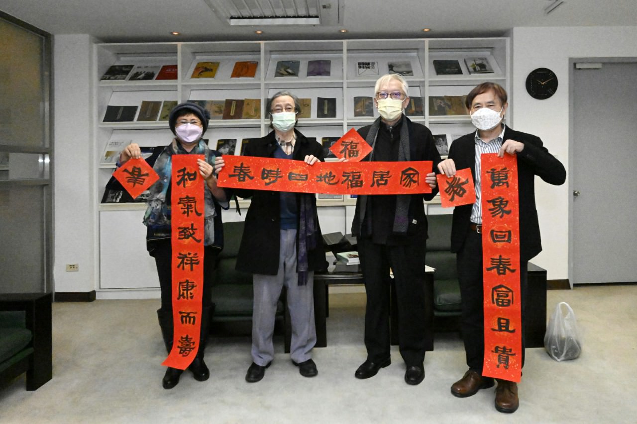 國美館長梁永斐(右2)贈送親筆書寫春聯予謝里法教授(左2)