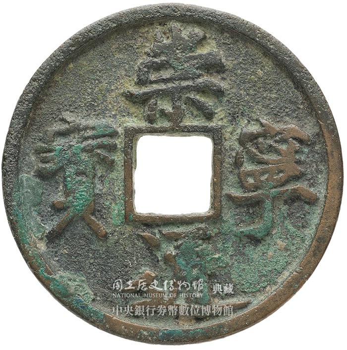 另一件館藏亮點是《崇寧通寶》,從唐高祖李淵鑄造第一枚「開元通寶」起,以「通寶」或「元寶」為錢幣定名的習慣延續至民初,長達千餘年。通寶在唐中期後,逐漸發展成為年號錢(新君登基,即發行以其年號為名的通寶)。而到了宋朝,錢文甚至還由皇帝親筆撰寫發行,被稱為「御書錢」。這枚「崇寧通寶」,可是由宋徽宗以他聞名於世的瘦金體所書寫的,昔日庶民兜裡成串使用的零錢,在今日卻成為藝術珍品。