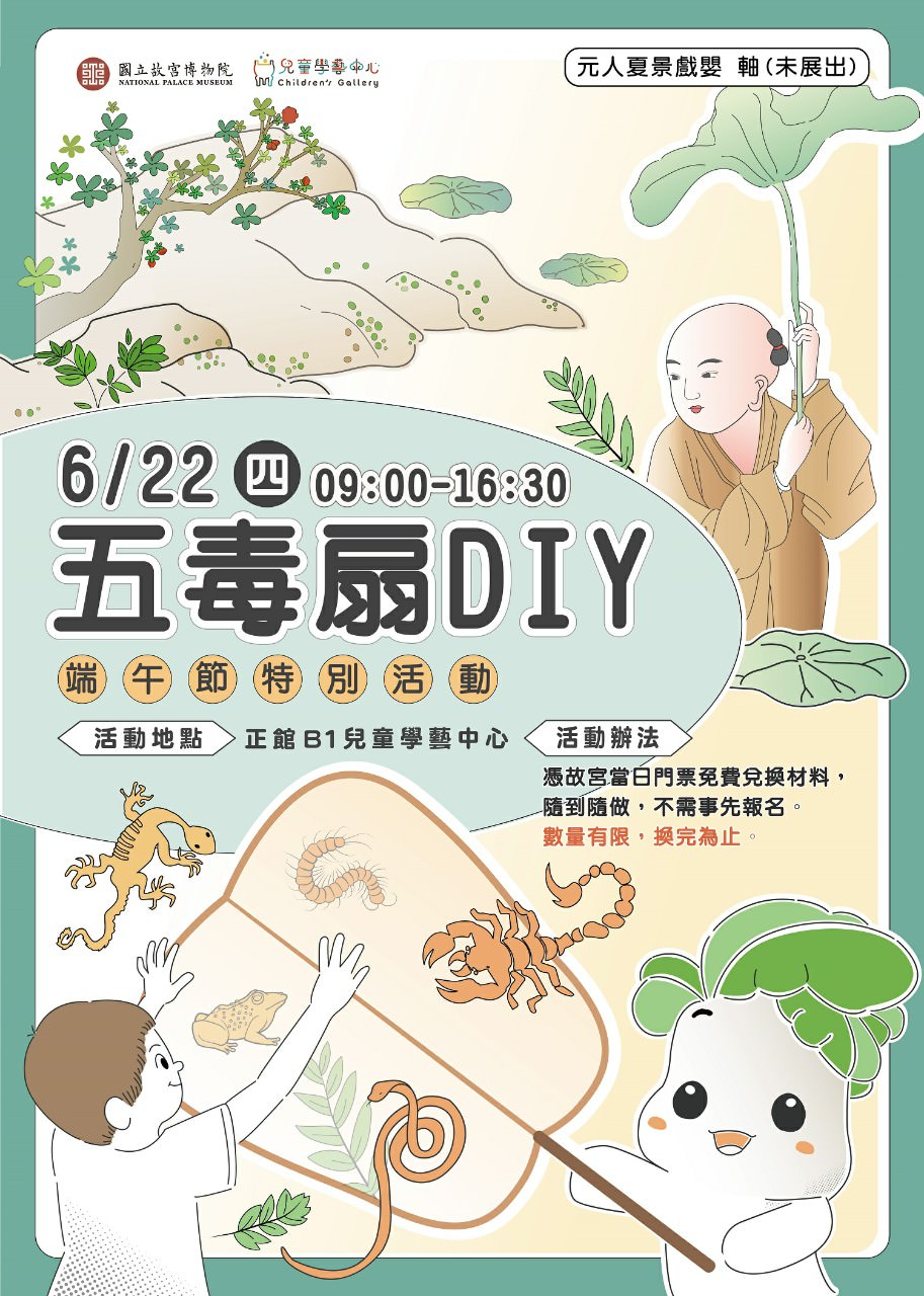 呼應端午「驅五毒」傳統習俗,6月22日於北部院區正館B1兒藝中心,推出五毒扇DIY。活動不限年齡、不須事先報名,憑當日門票即可免費兌換材料。歡迎民眾發揮巧思,用「五毒」蠍子、蛇、蜈蚣、壁虎、蟾蜍圖案印章,創造充滿藝術感的五毒扇。