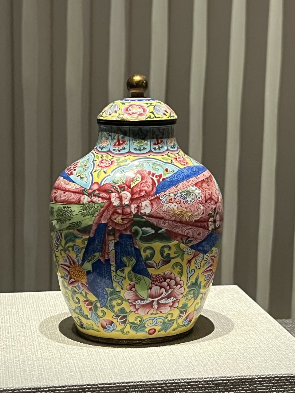 故宮南院「包羅萬象-院藏亞洲織品展」展出〈清 乾隆 銅胎畫琺瑯包袱紋蓋罐〉,瓶身包袱巾繫結紋飾與「包福」諧音,祝福民眾端午安康。