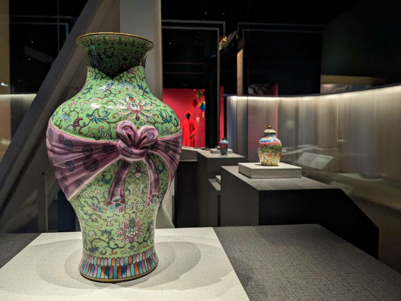 故宮南院展出〈清 嘉慶 粉彩番蓮紋包袱式瓶〉,瓶身包袱巾繫結紋飾精緻典雅。