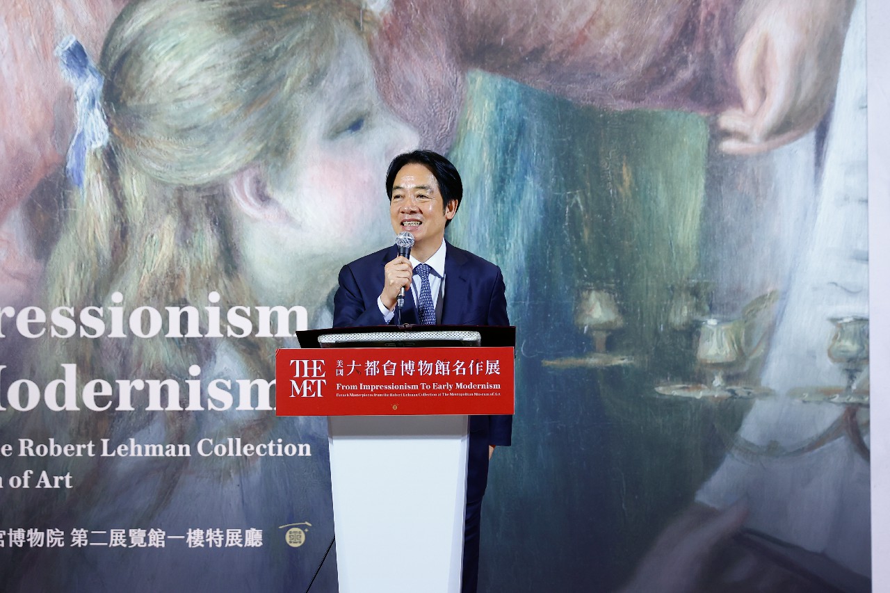 賴清德總統在致詞時表示:「謹向美國大都會博物館致上誠摯謝意,本次展覽橫跨百年藝術發展,集結38位偉大畫家的經典之作,包括梵谷、塞尚、雷諾瓦、馬諦斯等,共計81幅名作來臺展出,對臺灣而言意義深遠。故宮是國家重要的文化資產,不論是建館以來百年的發展歷程,或遷至臺北後近一甲子的深耕發展,皆需持續注入新生命,方能永續發展。正因如此,特於2017年擔任行政院長期間,核定推動『新故宮計畫』,總經費逾百億元,包括正館整建、第二展覽館改建、興建新行政大樓,以及拓展博物館群國際觀光網絡等,使故宮與全世界知名博物館連結,也促成今日『大都會博物館名作展』的誕生。展望未來,期勉故宮不僅要深耕地方,也要深耕國際。我們要走進世界,讓世界看見臺灣,也把世界帶進臺灣,讓故宮不只是臺灣的故宮,更是世界的故宮。」