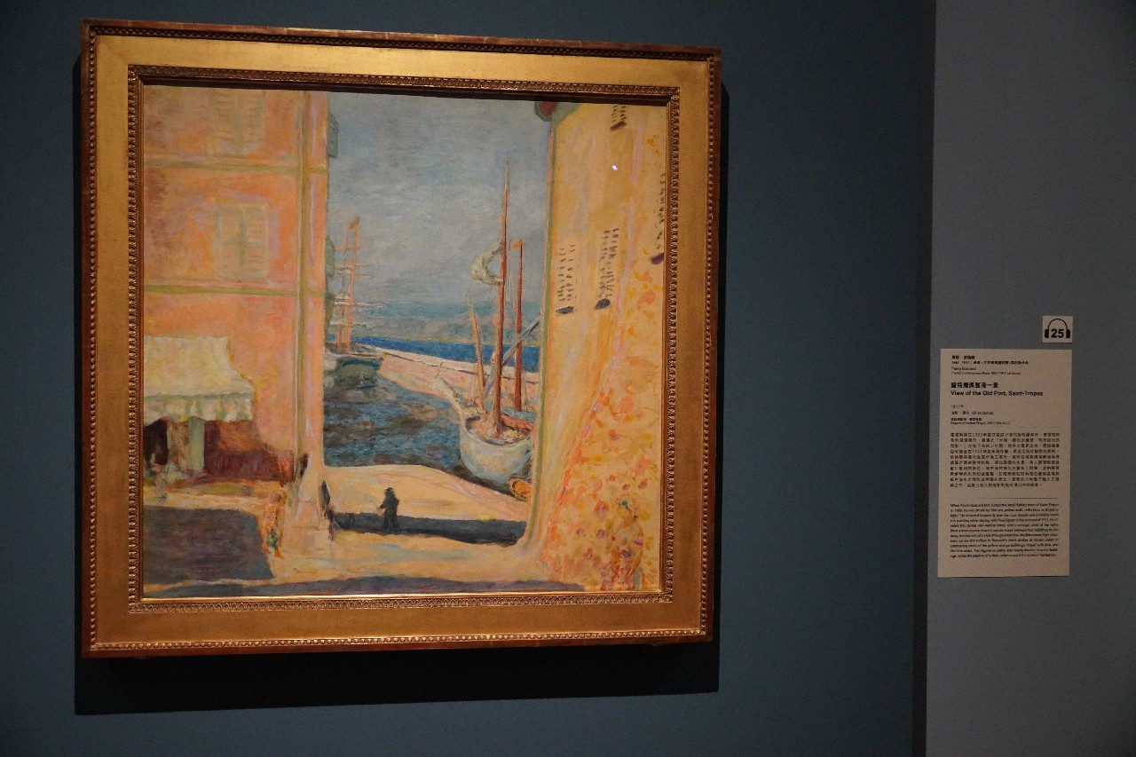 波納爾〈聖特羅佩舊港一景〉以光影與色彩重塑港口氛圍,展現水面反射的獨特魅力。(藝文報報/採訪拍攝)