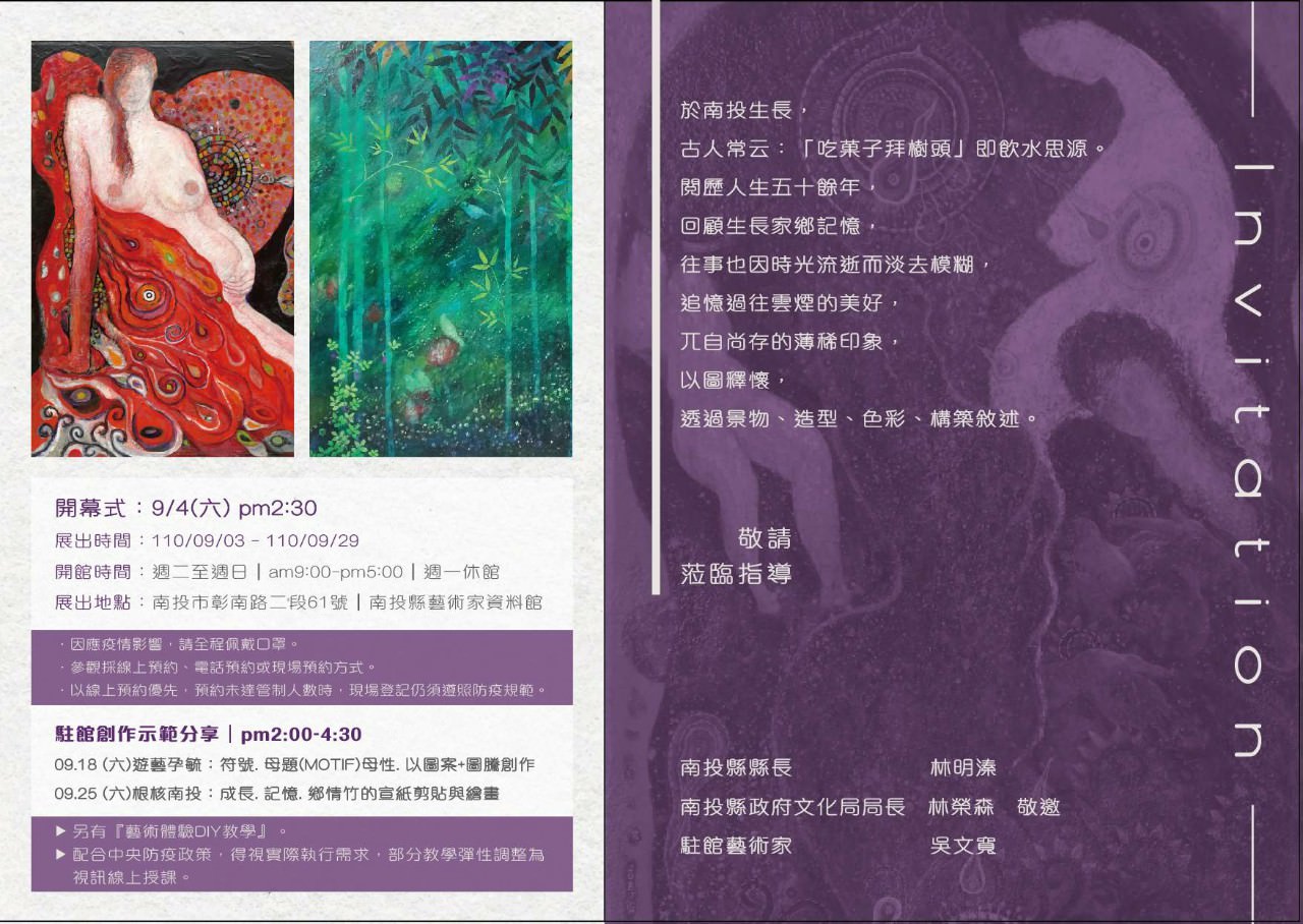 吳文寬老師出生於南投縣中寮鄉永和村,國立新竹教育大學美術研究所創作組(現清華大學藝設系)畢業,曾任台中市國教輔導團藝術與人文輔導員,並榮獲大專青年書畫展油畫第一名、第44屆省展水彩部及油畫部優選、全國美展第三名、公教美展水彩類及油畫類第一名、大墩美展油畫第二名。