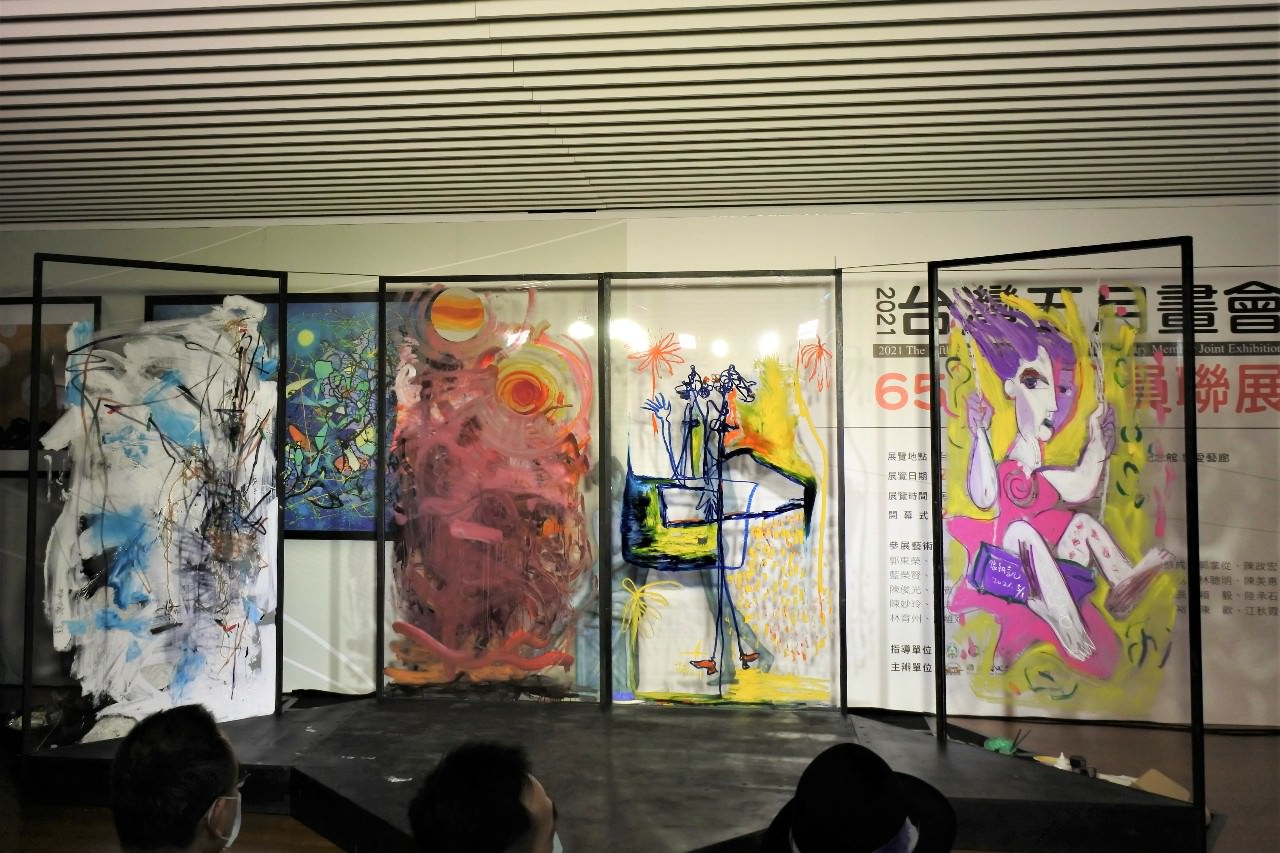 本次展出42幅油畫作品,其中畫作「合演」描畫出故鄉金山區至今仍保留著世界唯一的磺火漁法,俗稱「蹦火仔」,將地方景點燭台雙嶼、波濤洶湧的太平洋海浪、蹦火船上的磺火以及跳躍在海面上磷光閃閃的魚群,在夕陽餘暉景緻下全都融入畫作之中。
