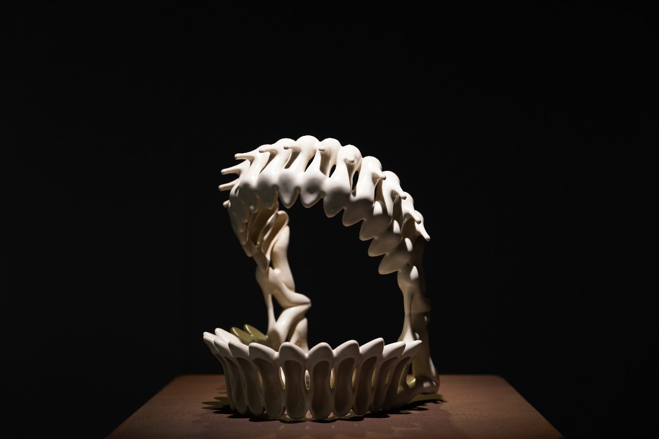 青年陶藝家陳安琦1993年出生在香港,在讀澳門理工學院視覺藝術系時,曾來國立臺灣藝術大學雕塑系當交換學生,目前就讀於國立臺北教育大學藝術與造形設計系研究所。本次展出的10件組作品,陳安琦將身體的感悟揉進陶土裡,拼出齒、骨骼的造型,個人風格鮮明。